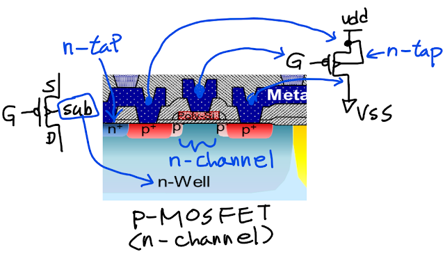 n-형 mos 트랜지스터의 적층 구조는 아래와 같다. p-형 바닥(subtrate)에 n 형 도전체를 간격을 두고 심어(implant) 양측을 각각 소스와 드레인으로 삼는다. 양의 바이어스 전압이 게이트에 걸면 p 채널이 도통된다. 채널 양쪽의 n 디퓨젼(NSD 레이어)은 완전히 대칭이므로 회로도 상으로 D와 S는 의미가 없다. 드레인과 소스를 구분하자면 전류원을 두는 전극에 따라 결정된다고 하겠다. 게이트에 바이어스가 걸리지 않을 경우 채널이 플로팅 되는 꼴이 되어 스위칭 성능을 저하시킨다. 이를 방지하기 위해 n-형 mos의 채널이 될 p형 바닥(subtrate)을 VSS 에 연결하였다. p-탭(tab)으로 표시되어 있다. 용도를 의미하는 것으로 제조공정상 p-우물(P-WELL)에 p-형 디퓨전을 심어 놓은 것이다.